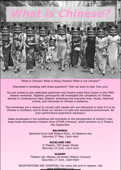 She will be holding free theatre workshops in Auckland starting this month for people interested in conversations about Chinese identity in Auckland today. It's a fun, inclusive and active way of connecting to people and sharing experiences.