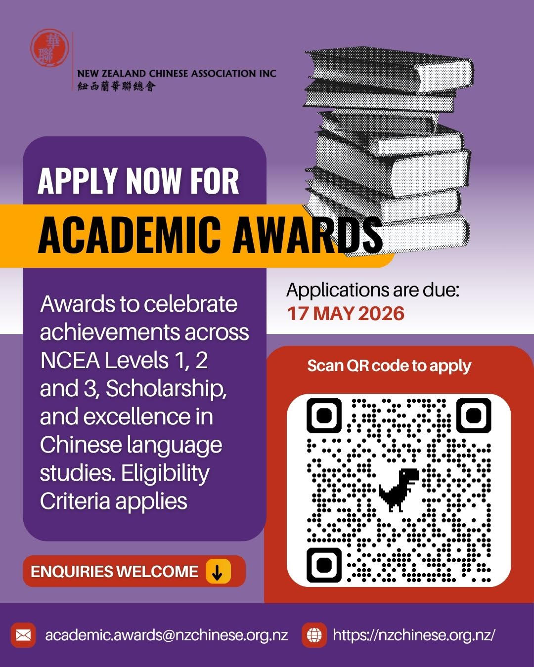 Applications for NCEA Levels 1, 2, 3 Academic Awards. Closing date has been extended until 17 May 2026.